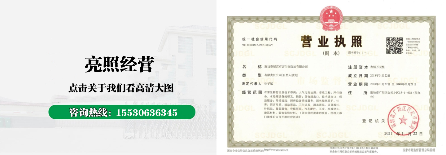 廊坊市綠營有害生物防治有限公司主要從事有害生物防治及環(huán)境消毒服務(wù),專注于白蟻預(yù)防工程、滅白蟻、滅老鼠、滅蟑螂、滅蚊蠅、滅跳蚤、滅臭蟲、滅紅火蟻、滅塵螨、消毒滅菌、家居清潔等有害生物的預(yù)防和治理服務(wù)。本公司面向,公共場(chǎng)所、商務(wù)樓、商場(chǎng)、超市、公園、工廠、酒店、餐廳、浴場(chǎng)、私人住宅等各類環(huán)境,公司一直堅(jiān)持以健康環(huán)保為前提,讓我們多一份健康”為宗旨,結(jié)合安全、、無反彈、對(duì)人畜安全無害,解決您的后顧之憂,與您共同打造一個(gè)無害、潔凈、舒適、健康的生活環(huán)境。...